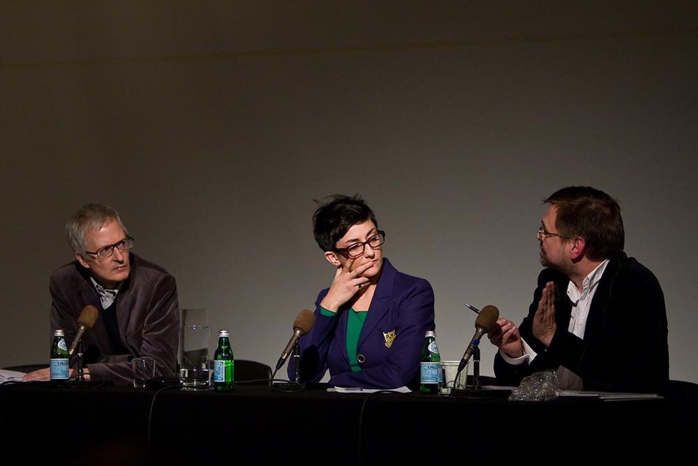 The Saturday afternoon panel at the Judgment and Contemporary Art Criticism symposium (from left) Jeff Derksen, Maria Fusco & Diedrich Diederichsen / photo Blaine Campbell