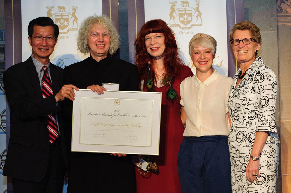 Ontario culture minister Michael Chan (left) and premier Kathleen Wynne (right) with Definitely Superior director David Karasiewicz, development administrator Renee Terpstra and youth outreach administrator Lora Northway